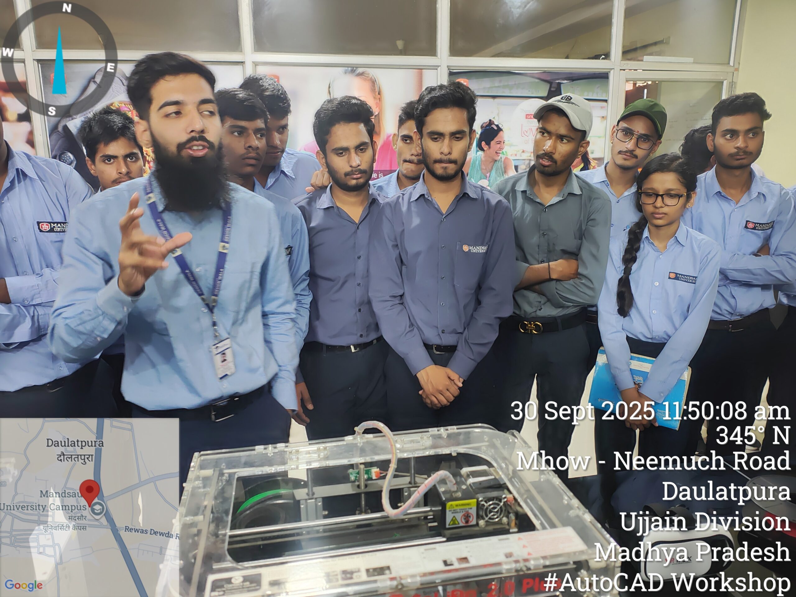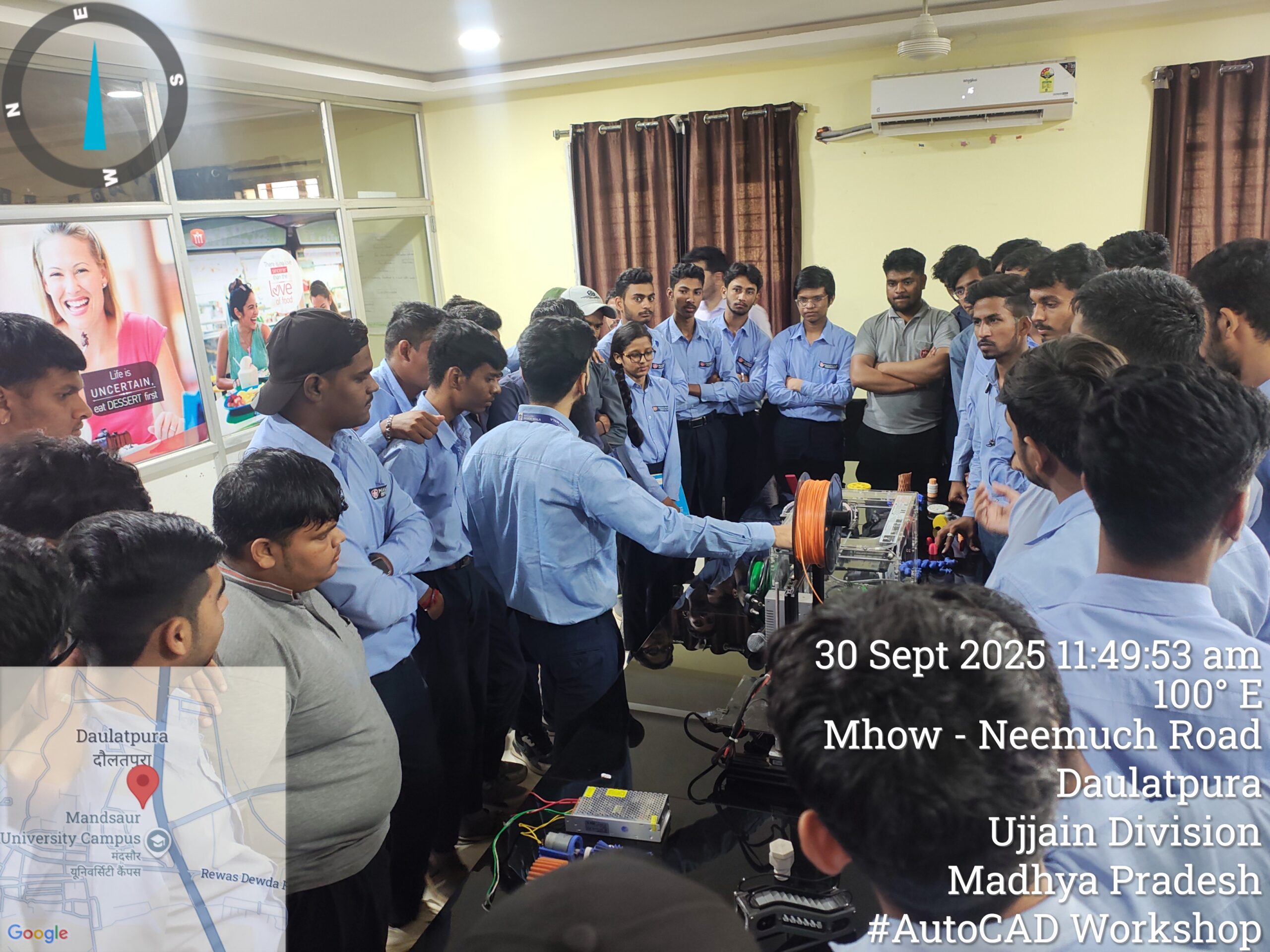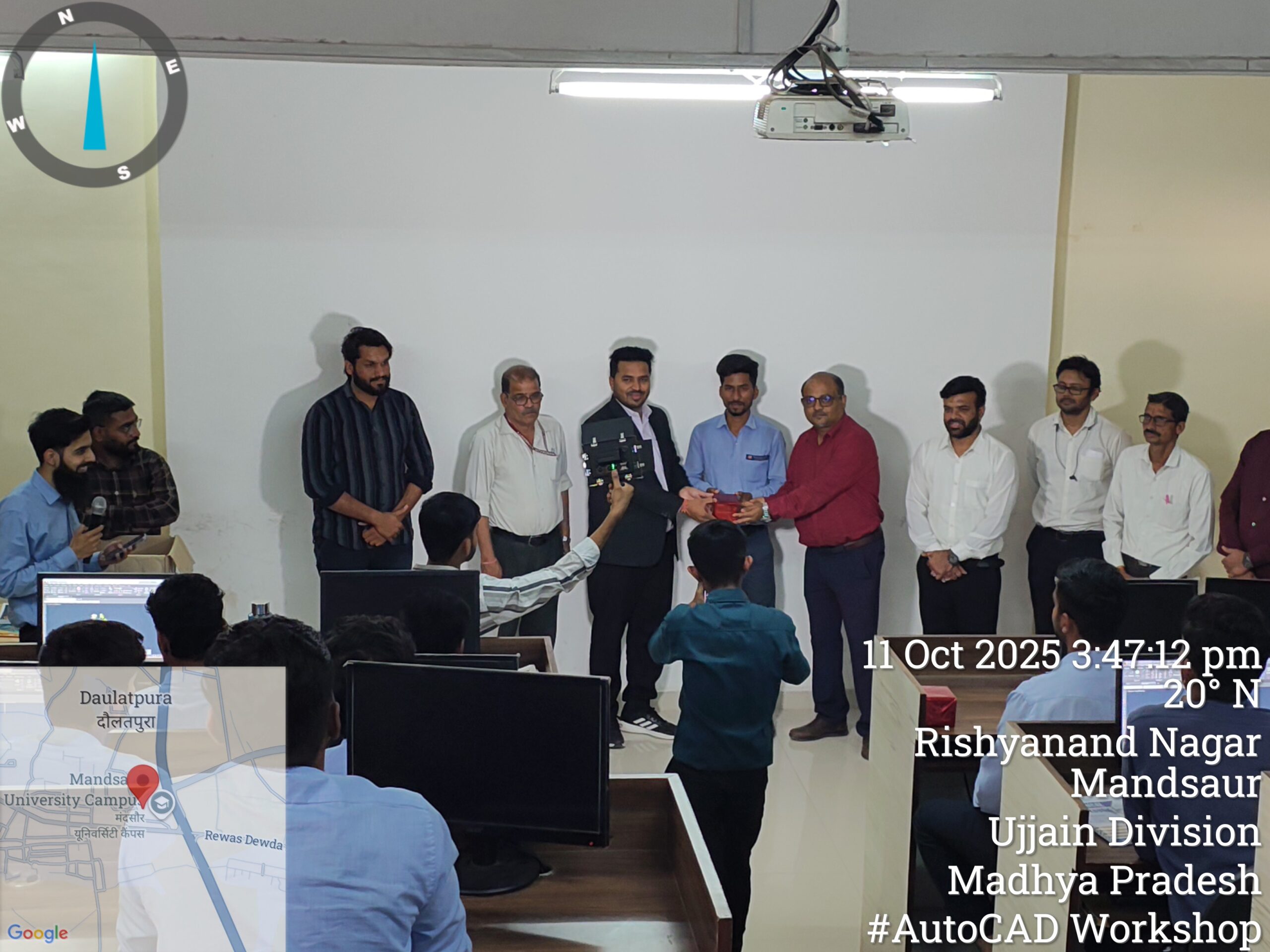 A 12-day AutoCAD workshop was jointly organized by the Departments of Electrical and Electronics Engineering and Mechanical Engineering for all B.Tech Electrical and Mechanical students. The sessions were led by Mr. Dharmendra Jat, a certified trainer and director of Tech Cluster Indore, who delivered extensive hands-on training and in-depth guidance on both 2D and 3D design concepts throughout the program.