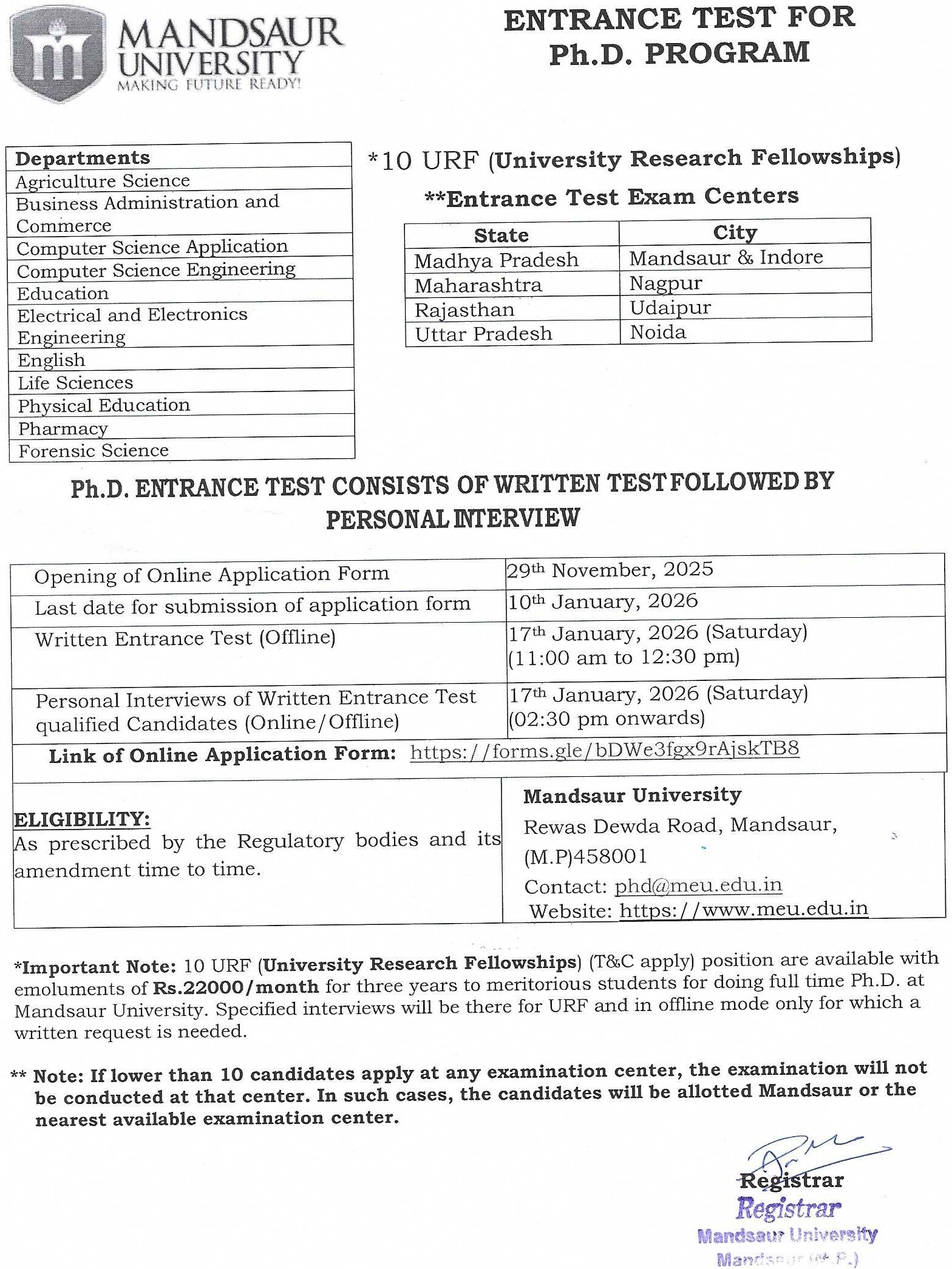 Public NoteApplications are invited for the admission in Ph.D. program in the following departments for the session July 2025:Syllabus for Ph.D. Entrance Test Agriculture Science Computer Science Application Management and Commerce Research Methology Pharmacy Computer Science Engineering Ayurveda Fashion Design Life Science Education Methamatics Journalism & Mass Communication Electrical and Electronics Engineering Physical Education Mechanical Engineering Library Information Science Link of Online Application FormNotification for Ph.D. AdmissionPh.D. Entrance Exam Result January 2026